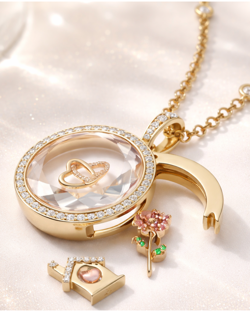 See how the charm memories locket beautifully captures your special moments, from tiny flower petals to birthday wishes. Its secure clasp keeps everything safe, while the fine chain adds a delicate touch to every outfit.